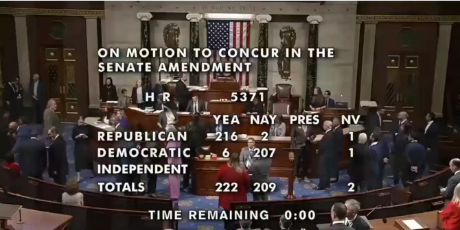 众议院的投票结果为222票赞成、209票反对,投票情况几乎完全按照党派立场划分。仅有两名共和党议员投下反对票,以此抗议赤字支出;另有六名民主党议员跨党派投出赞成票,称让联邦资金重新流动起来至关重要。