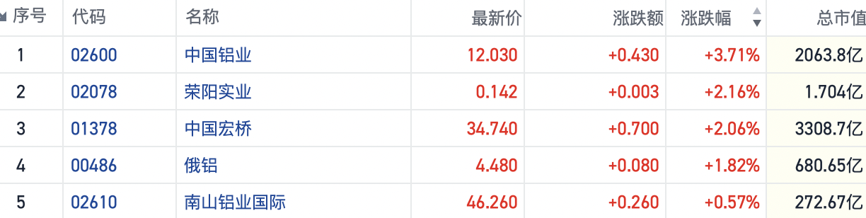 截至发稿,中国铝业(02600.HK)涨逾3%、中国宏桥(01378.HK)涨超2%,两大行业龙头均创下年内新高。俄铝(00486.HK)等公司也纷纷跟涨。
