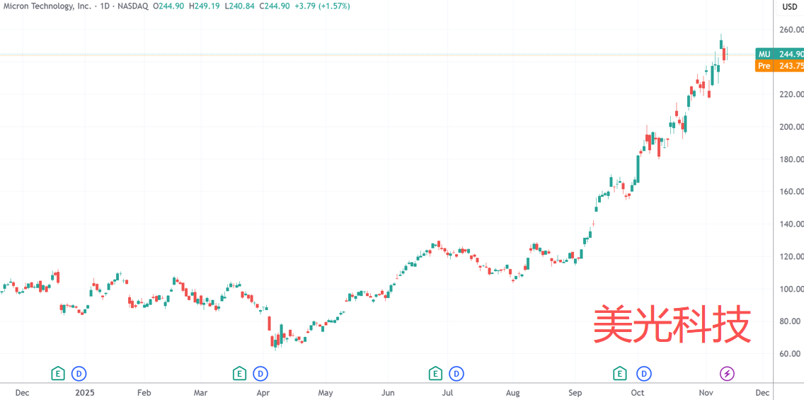 摩根士丹利半导体行业分析师约瑟夫·摩尔在最新报告中,将美光科技列为“首选”,并将目标价上调至华尔街最高的325美元,较公司当前价位还有33%的空间。