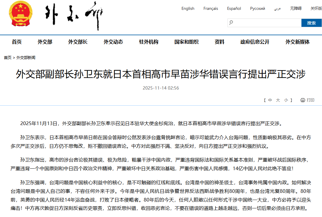财联社11月14日讯,据外交部网站消息,外交部副部长孙卫东就日本首相高市早苗涉华错误言行提出严正交涉。