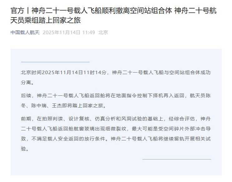 财联社11月14日讯,据中国载人航天工程办公室消息,北京时间2025年11月14日11时14分,神舟二十一号载人飞船与空间站组合体成功分离。
