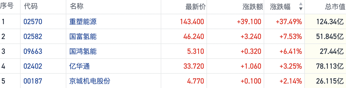 万亿氢能赛道再获政策利好催化 相关港股走强重塑能源一度暴涨70%