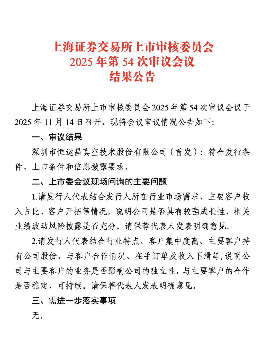 《科创板日报》11月14日讯(记者 黄修眉)今日,上交所上市委审核委员会2025年第54次审议会议通过了深圳市恒运昌真空技术股份有限公司(下称“恒运昌”)的科创板IPO申请,辅导机构为中信证券。该公司IPO申请于2025年6月13日获受理,经历两轮审核问询后,最终得以过会。