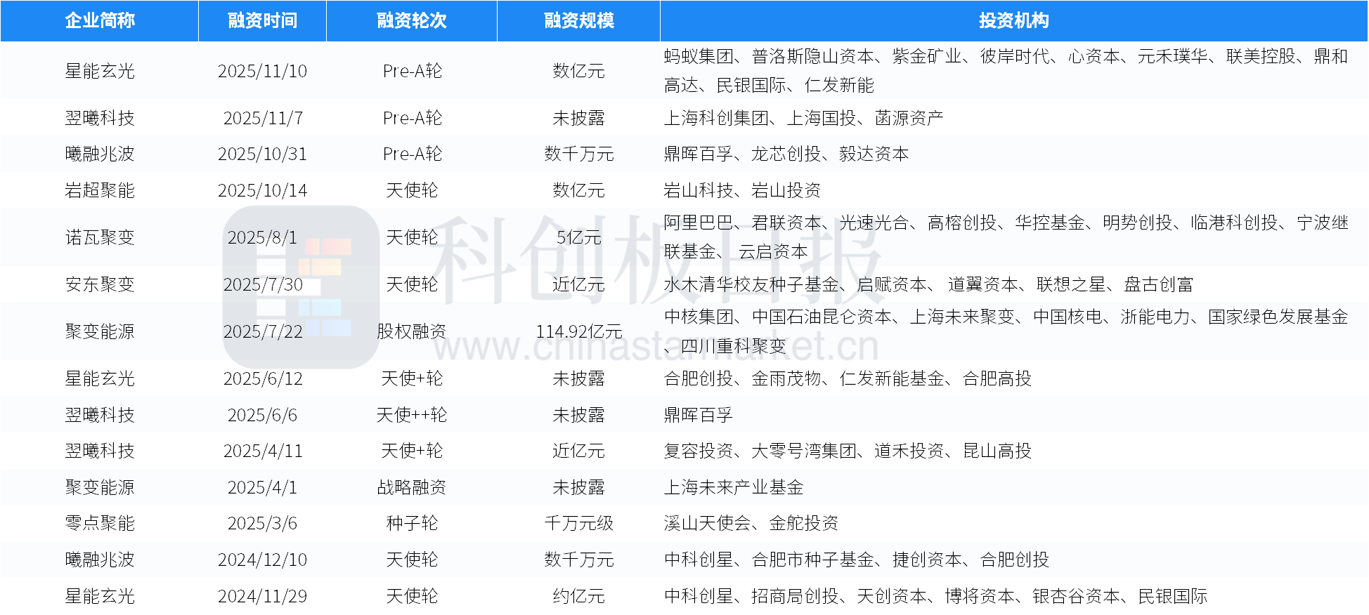 创投通数据显示,近一年来,国内可控核聚变领域部分获投案例如下。