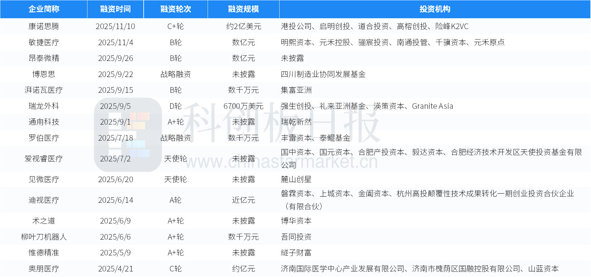创投通数据显示,近一年来,国内手术机器人领域部分获投案例如下。