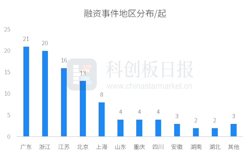 从地区来看,本周广东、浙江、江苏、北京等地公司较受青睐,融资事件数均在10起以上;广东以21起融资活跃度跃居首位。从单个城市看,北京、深圳各有13家公司获投,并列第一;杭州紧随其后,有11家公司获投。