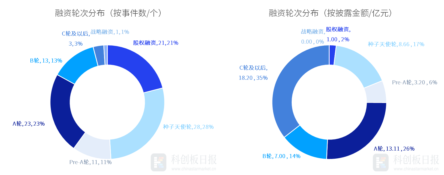 从投资轮次来看,除股权融资外,本周种子天使轮融资事件数最多,发生28起,占比28%;其次是A轮,发生23起,占比23%。从各轮次获投金额来看,C轮及以后披露的融资总额最高,约18.20亿元;其次是A轮,约13.11亿元。