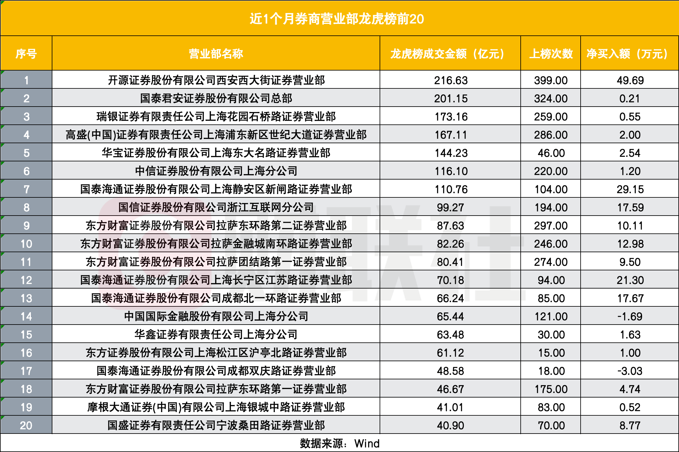 一是新锐营业部强势突围,开源证券西安西大街营业部表现尤为突出,近一个月以216.63亿元成交金额、49.69亿元净买入额跃居榜首,近半年排名也从上半年的第13位升至第4位,1536次上榜彰显区域资金挖掘实力。