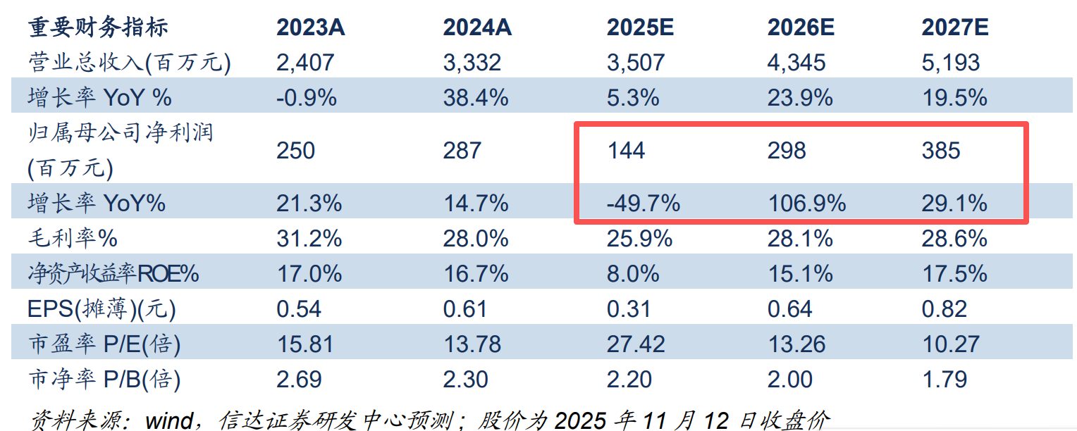姜文镪预计公司2025-2027年公司收入分别为35.01/43.45/51.93亿元(同比分别+5.3%、+23.9%+19.5%),归母净利润分别为1.4、3.0、3.9亿元,对应PE分别为27.4X、13.3X、10.3X。