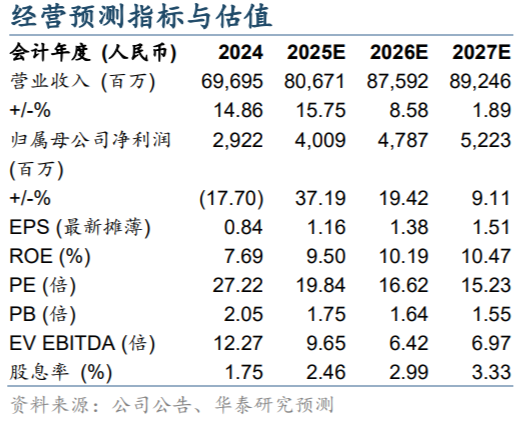 王玮嘉预计公司2025-2027年实现归母净利润40.1/47.9/52.2亿元,同比增长37.19%/19.42%/9.11%,对应PE分别为19.84/16.62/15.23倍。