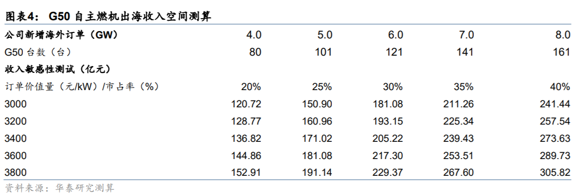 据华泰证券保守测算,若公司在欧美以外的海外市场占据20%市占率(对应约4GW,约80台G50),则有望贡献约120.72亿元的收入