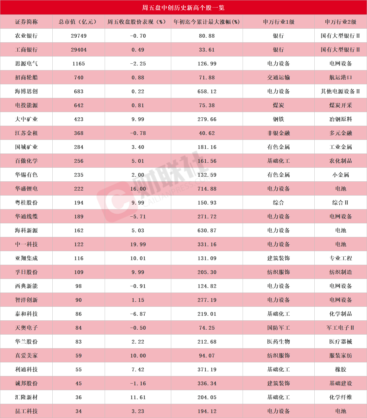 财联社11月16日讯(编辑 平方)据Choice数据统计显示,剔除新股和次新股,包括农业银行、工商银行、思源电气、招商轮船、海博思创、电投能源、大中矿业、江苏金租、国城矿业、百傲化学、华锡有色、华盛锂电、粤桂股份、华通线缆、海科新源、中一科技、亚翔集成、孚日股份、西典新能、智洋创新、泰和科技、天奥电子、华兰股份、真爱美家、利通科技、诚邦股份、汇隆新材、昆工科技在内的28家A股上市公司周五盘中创出历史新高(前复权),具体详见下图: