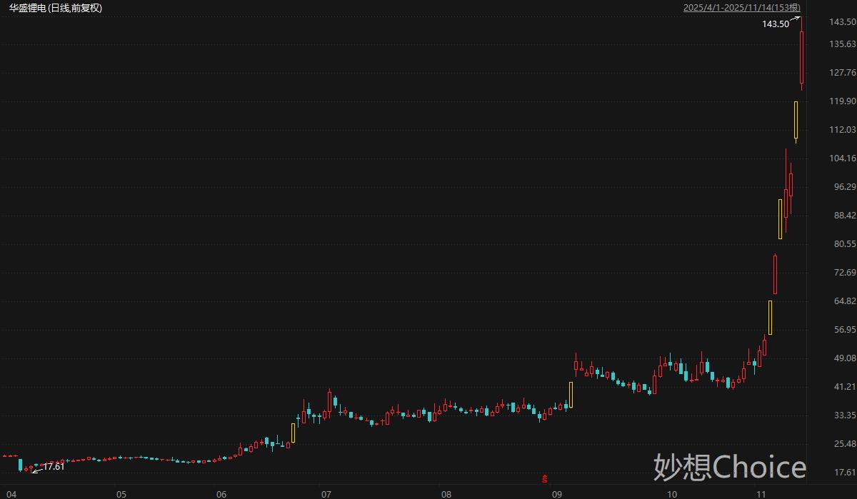 锂电池电解液添加剂全球龙头华盛锂电周五盘中一度逼近20CM涨停,最高触及142.50元/股,刷新历史新高,最新总市值222亿元。拉长时间来看,华盛锂电股价自4月低点迄今累计最大涨幅715%。华盛锂电11月12日在业绩说明会上表示,公司添加剂产品销售定价会按照随行就市原则动态调整。目前动力电池行业与储能行业正处于蓬勃发展的阶段,这也带动了包括添加剂产品在内的相关材料需求量的增长。添加剂价格受市场因素及其他不可预测因素的影响较大,价格波动存在一定的不确定性。