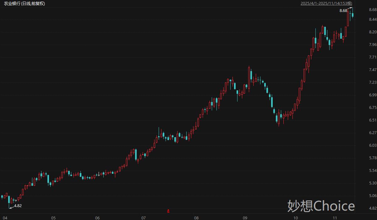 A股市场周五延续弱势整理结构,农业银行、工商银行双双再创历史新高,二者最新总市值分别为2.97万亿、2.94万亿。周五盘中二者分别触及8.68元/股、8.38元/股。国信证券分析师王剑等人10月31日研报认为,农业银行收入利润继续维持正增长,资产规模保持较快增长,公司三季度基本面变化不大,维持“优于大市”评级。东海证券分析师王鸿行11月7日研报认为,工商银行客户基础良好、业务多元,预计仍能在压力上升的经营环境中实现稳健经营;财政部对国有大行注资将提升市场对国有行信心;公司分红稳定、股息率较高,对保险、社保基金、被动基金等长线资金具有较强吸引力,维持“增持”评级。