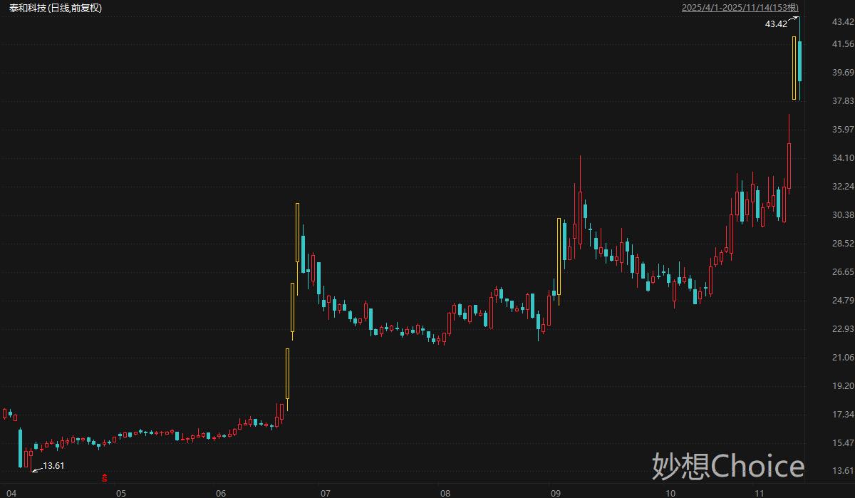 主营水处理药剂及其联副产品的泰和科技周五盘中最高触及43.42元/股,刷新历史新高,最新总市值85亿元。拉长时间来看,泰和科技股价自4月低点迄今累计最大涨幅219%。泰和科技11月13日发布股票交易异常波动公告称,公司的碳酸亚乙烯酯(VC)项目一期设计产能为1万吨/每年,目前正在技术改造,具体投产时间请关注后续相关公告。碳酸亚乙烯酯(VC)项目二期建设情况将视项目一期的市场拓展情况进行调整,具有一定的不确定性。