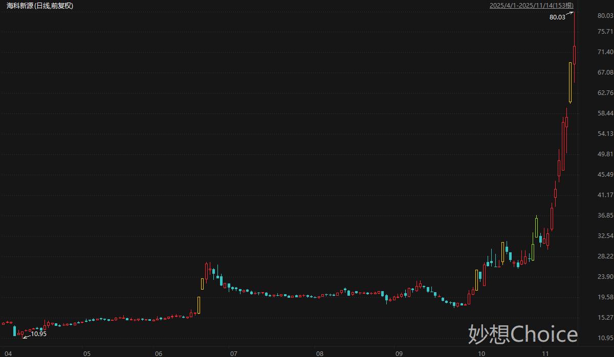锂电池电解液溶剂产品全球市占率第一的海科新源周五盘中一度大涨超15%,最高触及80.03元/股,刷新历史新高,最新总市值162亿元。拉长时间来看,海科新源股价自4月低点迄今累计最大涨幅631%。海科新源11月11日公告称,公司与昆仑新材签署《战略合作暨原材料供货协议》,昆仑新材在协议有效期内(自2026年1月1日至2028年12月31日)预计向海科新源购买电解液溶剂59.62万吨。海科新源10月30日在互动平台表示,当前,电解液市场的回暖,相信将为公司发展带来积极而深远的推动作用。