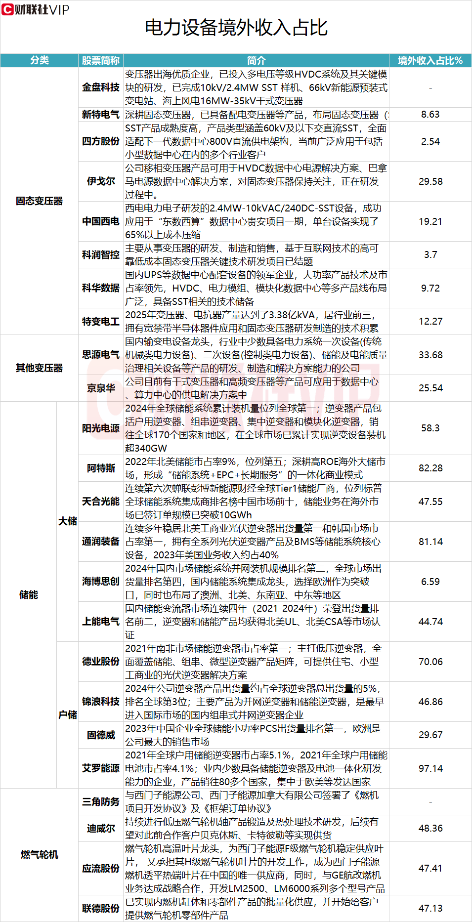 据财联社VIP数据梳理电力设备的储能环节中,大储主要包括阳光电源、阿特斯、天合光能、通润装备、海博思创、上能电气等;户储主要包括德业股份、锦浪科技、固德威、艾罗能源等境外营收占比靠前。具体情况见下图: