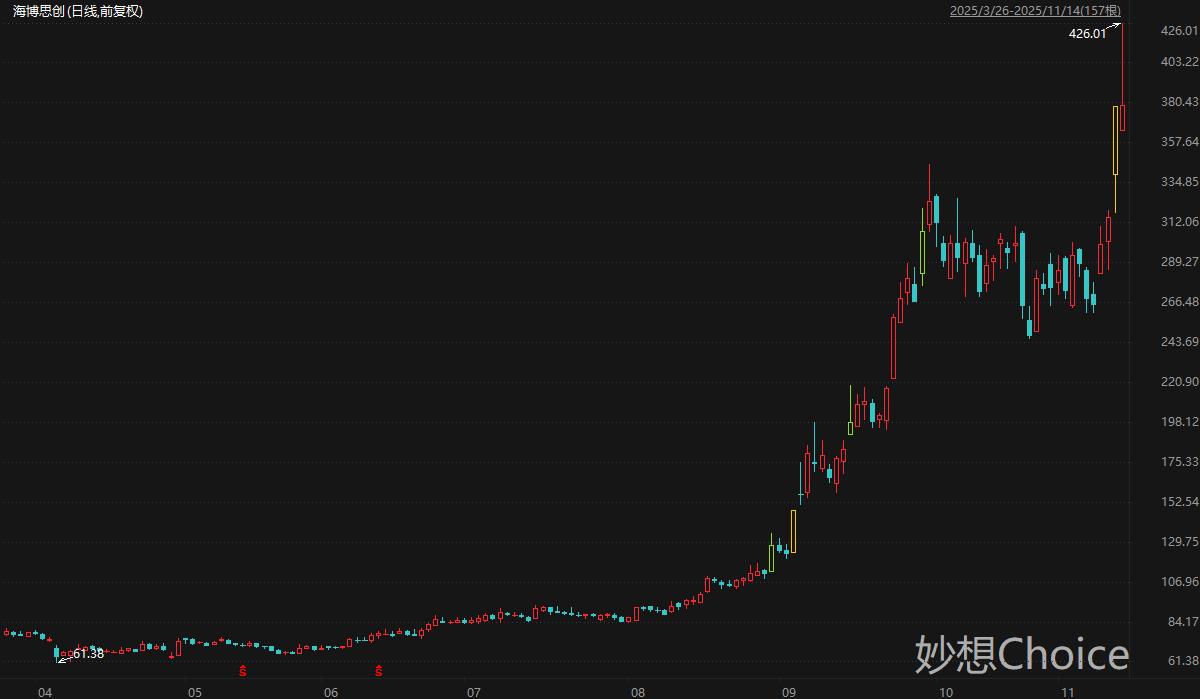 海博思创2024年国内市场储能系统并网装机规模排名第二,全球市场出货量排名第四,国内储能系统集成龙头,选择欧洲作为突破口,同时也布局了澳洲、北美、东南亚、中东等地区。国泰海通分析师徐强等人11月11日研报指出,考虑到储能需求旺盛,海博思创作为储能系统的龙头企业,有望充分受益于行业高景气度,上调公司2025-2026年盈利预测,预计公司2025-2027年的EPS分别为5.45/13.22/17.89元。二级市场方面,海博思创周五盘中一度大涨超12%,最高触及426.01元/股,创历史新高,其股价自1月低点迄今累计最大涨幅658%。