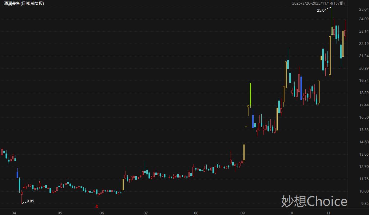 通润装备境外收入占比81.14%。公司连续多年稳居北美工商业光伏逆变器出货量第一和韩国市场市占率第一,拥有全系列光伏逆变器产品及BMS等储能系统核心设备,2023年美国业务收入约占40%。东吴证券分析师曾朵红等人10月27日研报认为,估计通润装备2025Q3逆变器出货2-3GW,展望2025Q4,为传统需求旺季叠加部分项目延至2025Q4确收,预计2025Q4业绩环比高增。二级市场方面,通润装备股价自4月低点迄今累计最大涨幅154%。