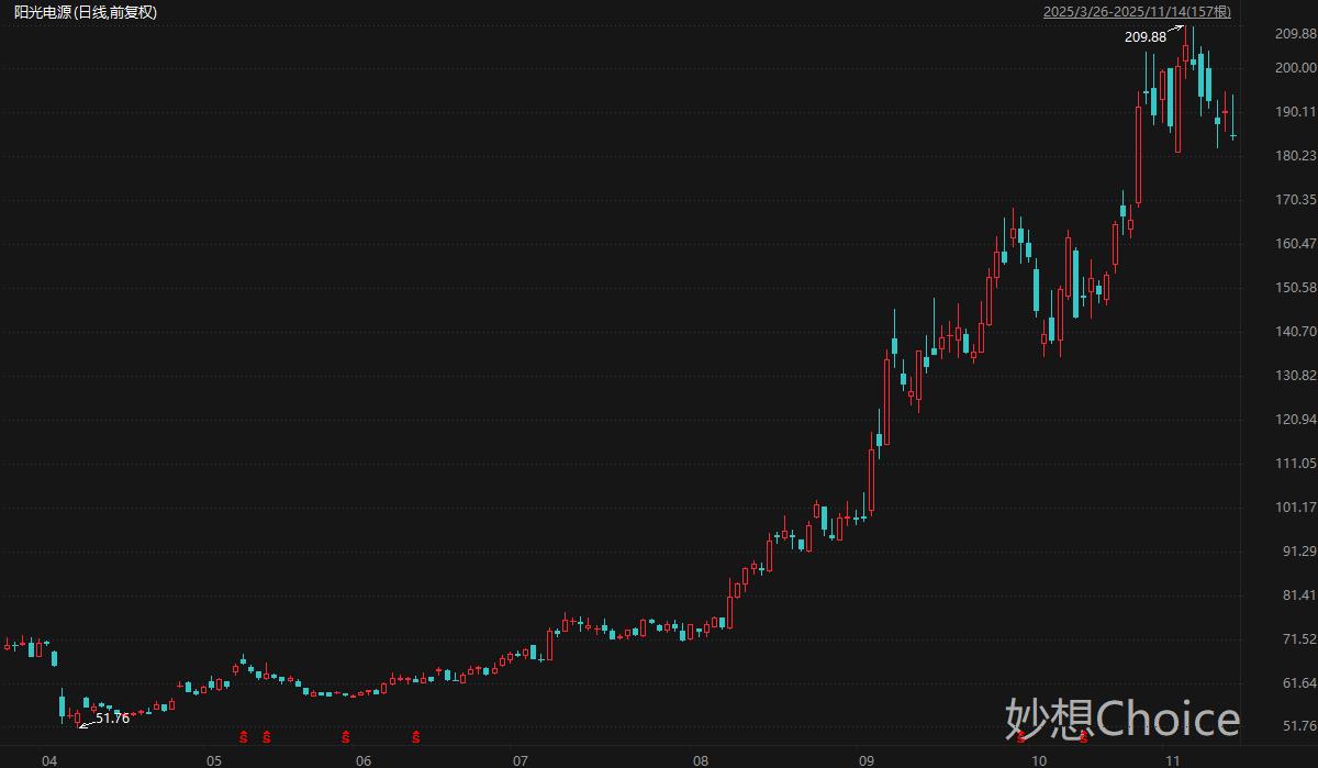 其中,阳光电源2024年全球储能系统累计装机量位列全球第一,境外收入占比58.3%。其逆变器产品包括户用逆变器、组串逆变器、集中逆变器和模块化逆变器,销往全球170个国家和地区,在全球市场已家计实现逆变设备装机超340GW。民生证券分析师邓永康等人11月2日研报认为,阳光电源2025年全年储能出货目标40-50GWh,相比2024年28GWh的发货量有望大幅提升。展望2026年,全球储能市场有望保持40-50%的高增速,阳光电源储能业务有望受益于全球储能需求的增长,保持较好的发展态势。二级市场方面,阳光电源股价自4月低点迄今累计最大涨幅305%。