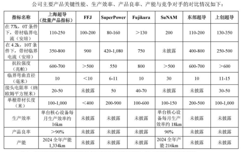 其中,针对上海超导主要产品关键性能、生产效率、产品良率、产能与竞争对手的对比情况,公司通过表格对比的方式做了解释说明。