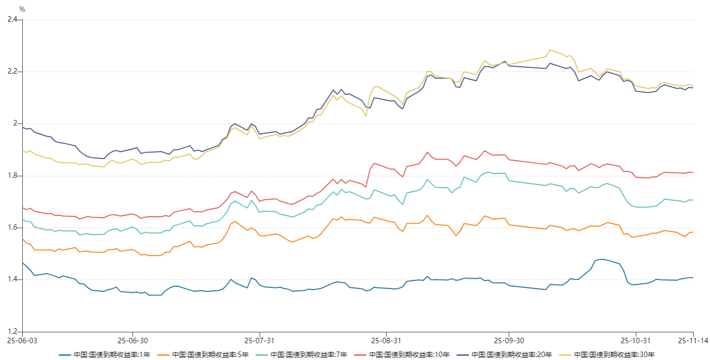 上周,主要利率债收益率震荡下跌。截至11月14日收盘,1Y、5Y、7Y国债分别报收1.41%、1.58%、1.71%,分别较前一周收盘变动1BP、-1BP、-0.4BP;10Y、20Y、30Y国债分别报收1.81%、2.14%、2.15%,分别均较前一周收盘变动-0.09BP、-1BP、-1BP。