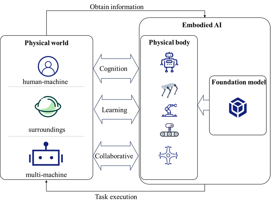 该文件明确了具身智能的定义、系统框架和关键能力要求。按照定义,具身智能(Embodied Artificial Intelligence)指与物理实体融合的人工智能,能自主与物理世界交互并适应环境。其概念及关键特征如下图所示: