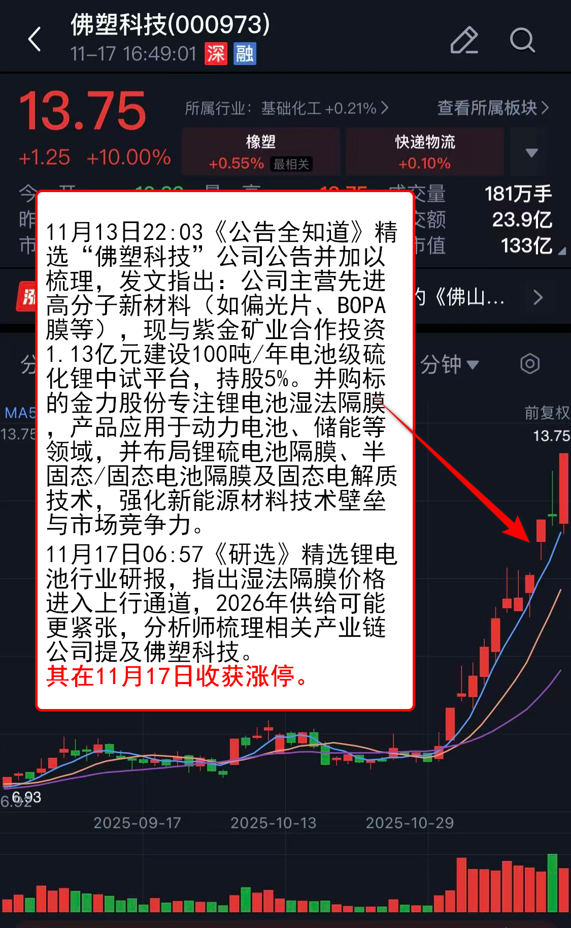 11月13日22:03《公告全知道》精选“佛塑科技”公司公告并加以梳理,发文指出:公司主营先进高分子新材料(如偏光片、BOPA膜等),现与紫金矿业合作投资1.13亿元建设100吨/年电池级硫化锂中试平台,持股5%。并购标的金力股份专注锂电池湿法隔膜,产品应用于动力电池、储能等领域,并布局锂硫电池隔膜、半固态/固态电池隔膜及固态电解质技术,强化新能源材料技术壁垒与市场竞争力。