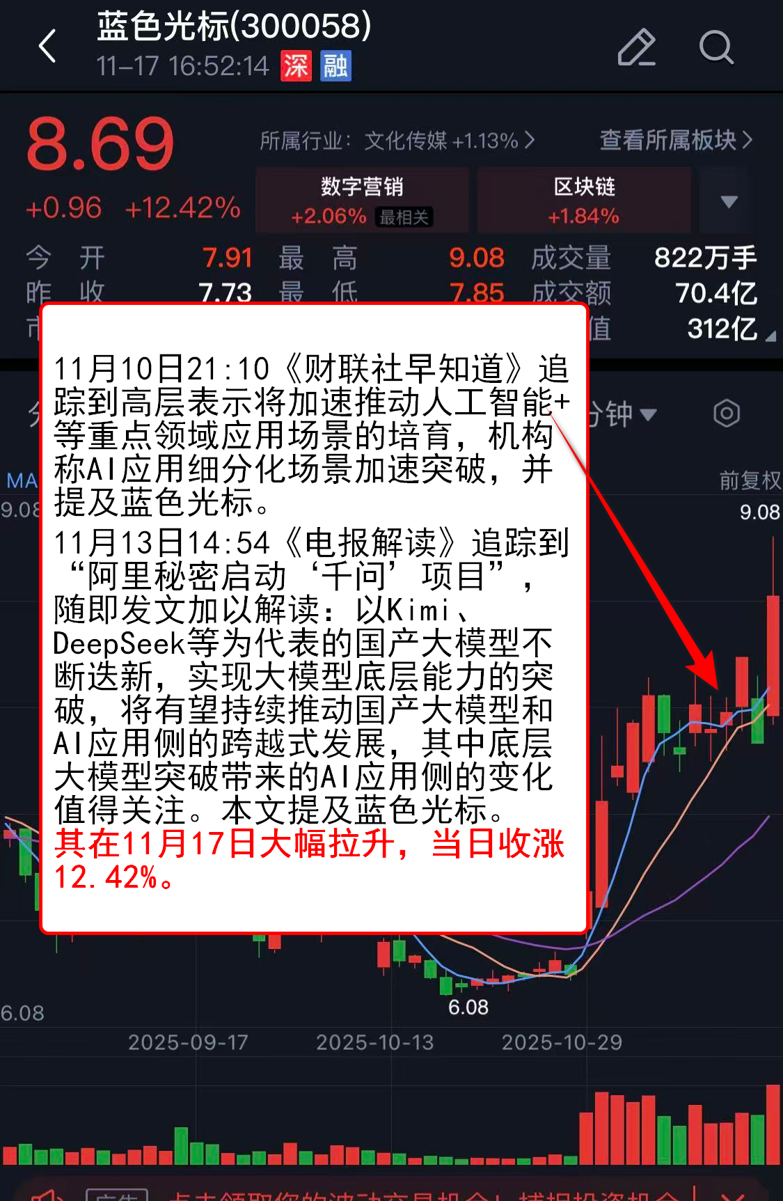 11月10日21:10《财联社早知道》追踪到高层表示将加速推动人工智能+等重点领域应用场景的培育,机构称AI应用细分化场景加速突破,并提及蓝色光标。