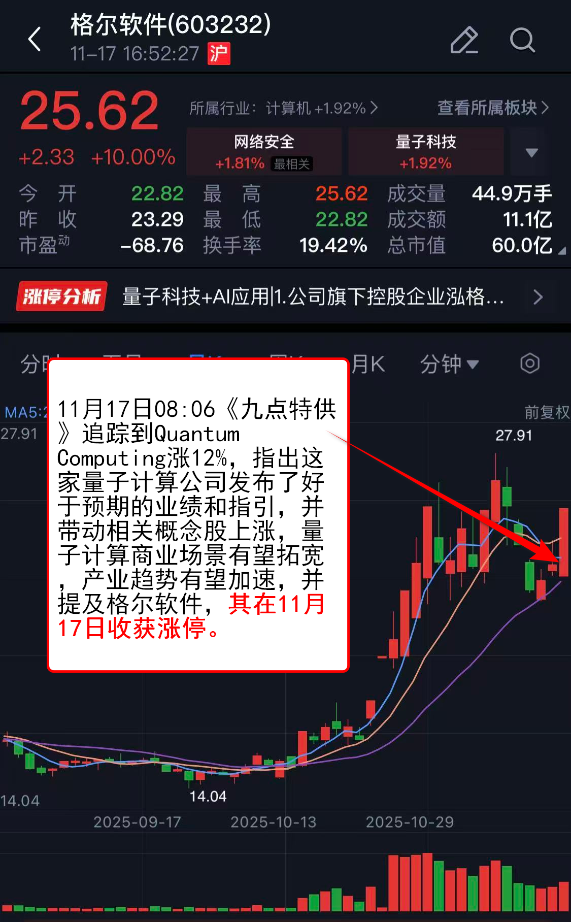 11月17日08:06《九点特供》追踪到Quantum Computing涨12%,指出这家量子计算公司发布了好于预期的业绩和指引,并带动相关概念股上涨,量子计算商业场景有望拓宽,产业趋势有望加速,并提及格尔软件,其在11月17日收获涨停。