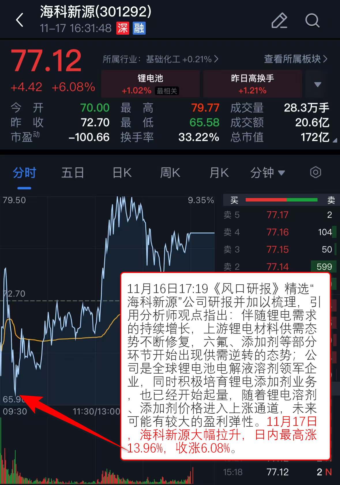 11月16日17:19《风口研报》精选“海科新源”公司研报并加以梳理,引用分析师观点指出:伴随锂电需求的持续增长,上游锂电材料供需态势不断修复,六氟、添加剂等部分环节开始出现供需逆转的态势;公司是全球锂电池电解液溶剂领军企业,同时积极培育锂电添加剂业务,也已经开始起量,随着锂电溶剂、添加剂价格进入上涨通道,未来可能有较大的盈利弹性。11月17日,海科新源大幅拉升,日内最高涨13.96%,收涨6.08%。