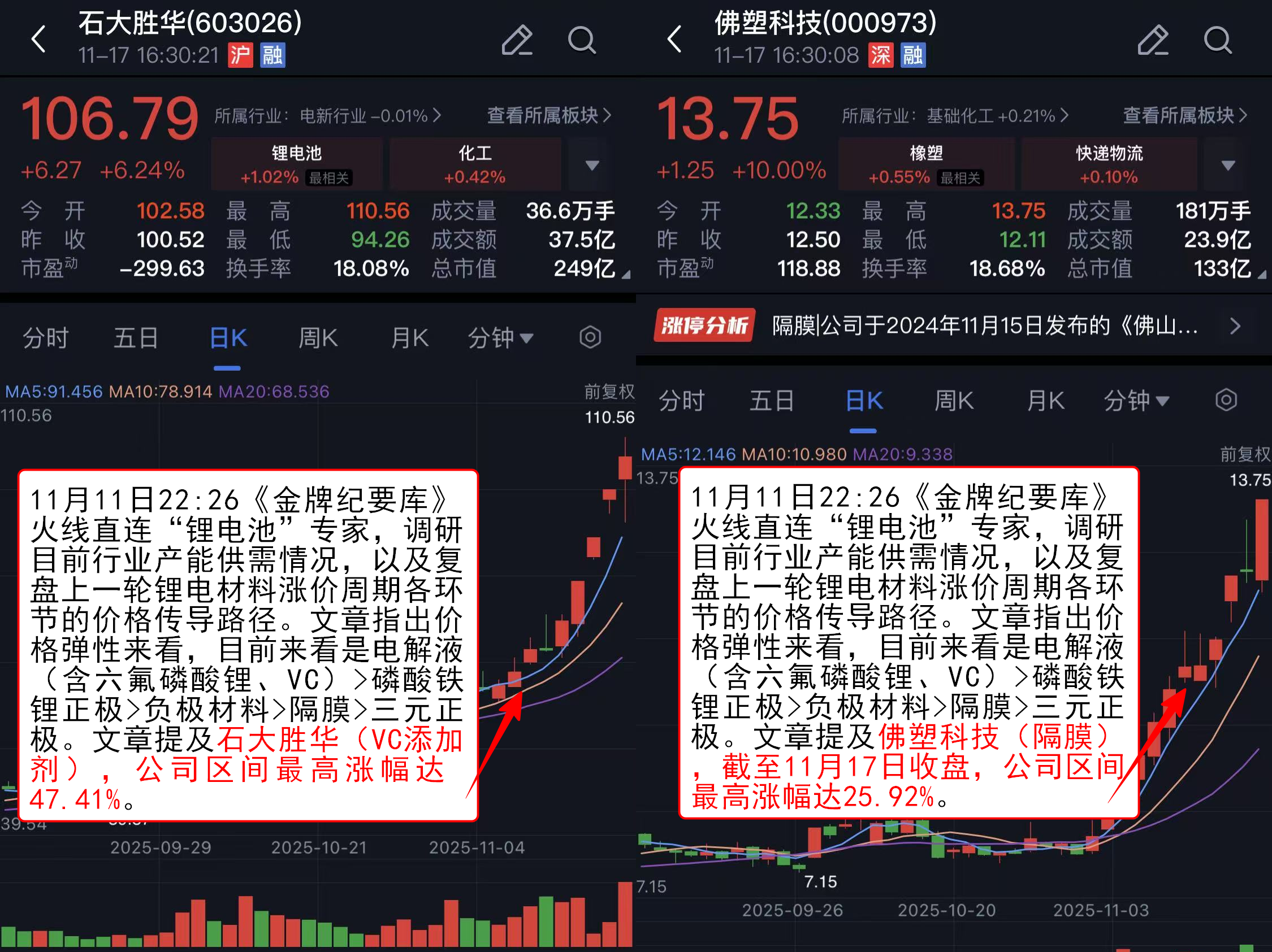 11月11日22:26《金牌纪要库》火线直连“锂电池”专家,调研目前行业产能供需情况,以及复盘上一轮锂电材料涨价周期各环节的价格传导路径。文章指出价格弹性来看,目前来看是电解液(含六氟磷酸锂、VC)>磷酸铁锂正极>负极材料>隔膜>三元正极。文章提及佛塑科技(隔膜),截至11月17日收盘,公司区间最高涨幅达25.92%。文章提及石大胜华(VC添加剂),公司区间最高涨幅达47.41%。