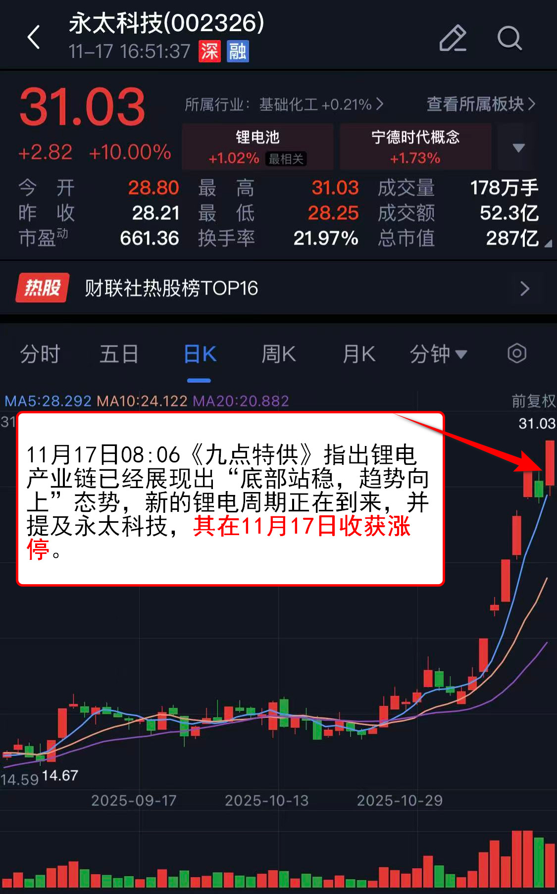 11月17日08:06《九点特供》指出锂电产业链已经展现出“底部站稳,趋势向上”态势,新的锂电周期正在到来,并提及永太科技,其在11月17日收获涨停。