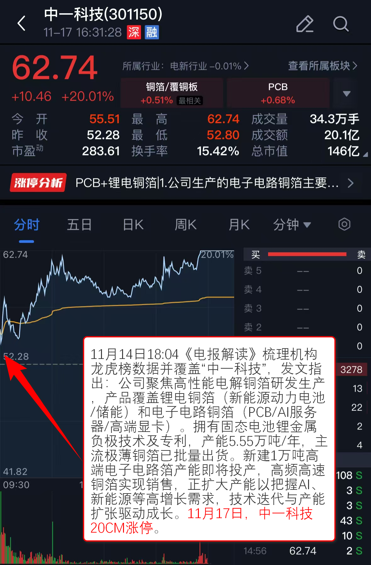 11月14日18:04《电报解读》梳理机构龙虎榜数据并覆盖“中一科技”,发文指出:公司聚焦高性能电解铜箔研发生产,产品覆盖锂电铜箔(新能源动力电池/储能)和电子电路铜箔(PCB/AI服务器/高端显卡)。拥有固态电池锂金属负极技术及专利,产能5.55万吨/年,主流极薄铜箔已批量出货。新建1万吨高端电子电路箔产能即将投产,高频高速铜箔实现销售,正扩大产能以把握AI、新能源等高增长需求,技术迭代与产能扩张驱动成长。11月17日,中一科技20CM涨停。