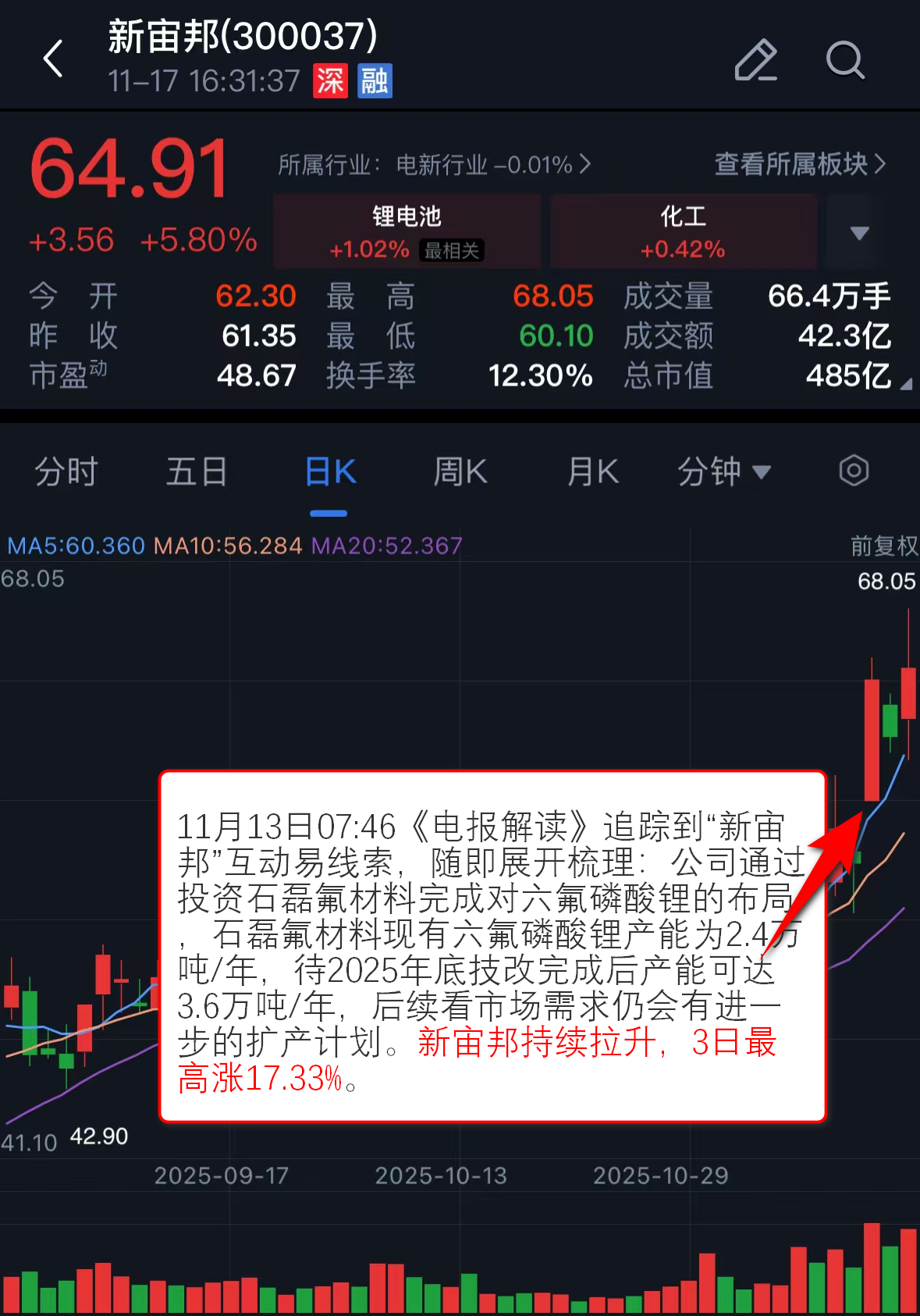 11月13日07:46《电报解读》追踪到“新宙邦”互动易线索,随即展开梳理:公司通过投资石磊氟材料完成对六氟磷酸锂的布局,石磊氟材料现有六氟磷酸锂产能为2.4万吨/年,待2025年底技改完成后产能可达3.6万吨/年,后续看市场需求仍会有进一步的扩产计划。新宙邦持续拉升,3日最高涨17.33%。