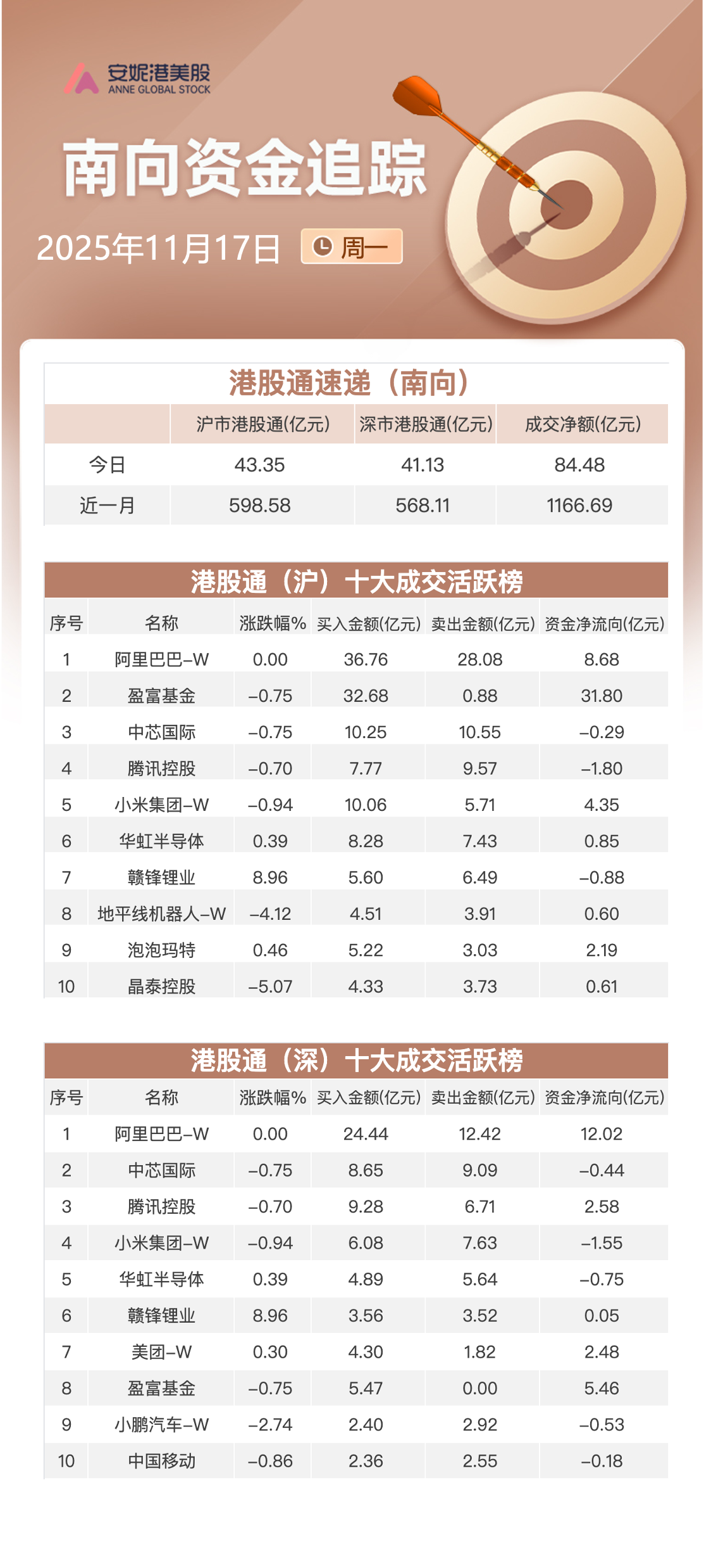 港股今日延续调整,南向资金全天净买入约84.48亿港元。其中,沪港股通净流入约43.35亿港元,深港股通净流入约41.13亿港元。
