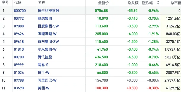 盘面上,今日大型科技股、及金融、蓝筹权重表现低迷,明显拖累大市行情。科技股中,百度跌近3%,京东、小米、腾讯、网易均绿盘报收,仅美团逆势翻红。