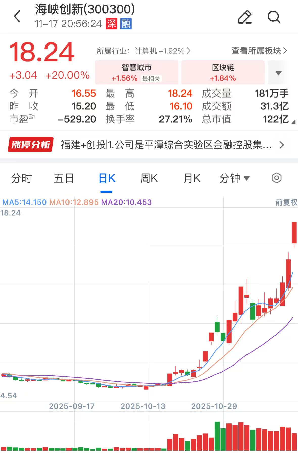 今日晚间,海峡创新发布公告称,公司股票自10月27日至11月17日价格涨幅为185.89%,期间于2025年10月28日、11月4日、11月17日出现三次股价异常波动或严重异常波动,严重背离公司基本面。为维护投资者利益,公司将就股票交易波动情况进行核查。经公司申请,公司股票自11月18日开市起停牌,待核查结束并披露相关公告后复牌,预计停牌时间不超过3个交易日。