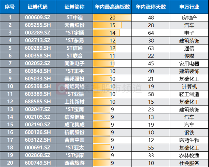 分行业板块(申万一级)来看,年内录得7连板及以上的高位连板股中,建筑装饰、机械设备、基础化工股数量相对较多,同时还涵盖汽车、通信、医药生物、电力设备、电子等板块。若剔除ST股,剩余近30股中,其来自于机械设备、基础化工、汽车板块的个股相对较多,同时还涵盖电力设备、家用电器、建筑装饰、通信、医药生物等板块。