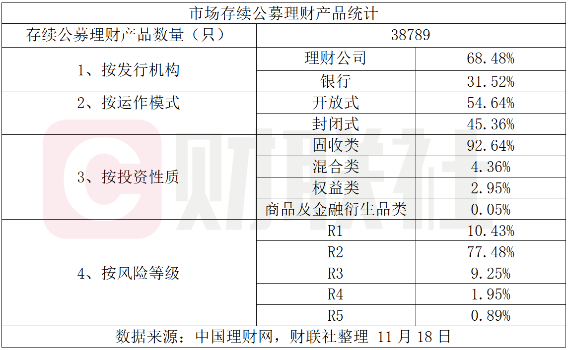 存续产品方面,财联社据中国理财网数据统计,截至11月18日,全市场共有存续理财产品38789款。其中,固收类产品数量达到35894款,占比92.64%。