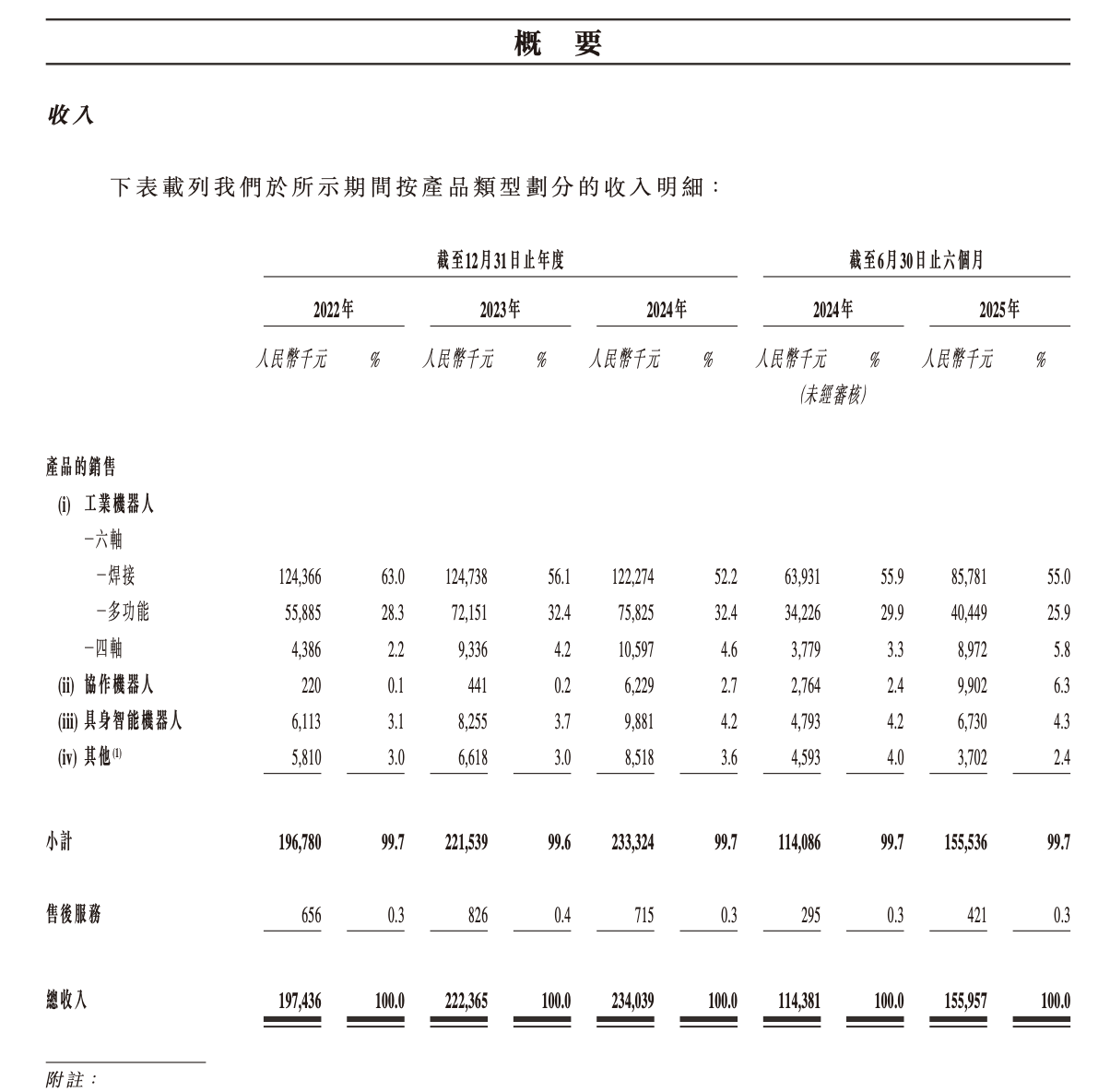 卡诺普的收入主要来自工业机器人,2025年上半年来自六轴焊接机器人的收入8578万元,占总营收比例55%,来自六轴多功能机器人的收入为4045万元,占总营收比例25.9%。