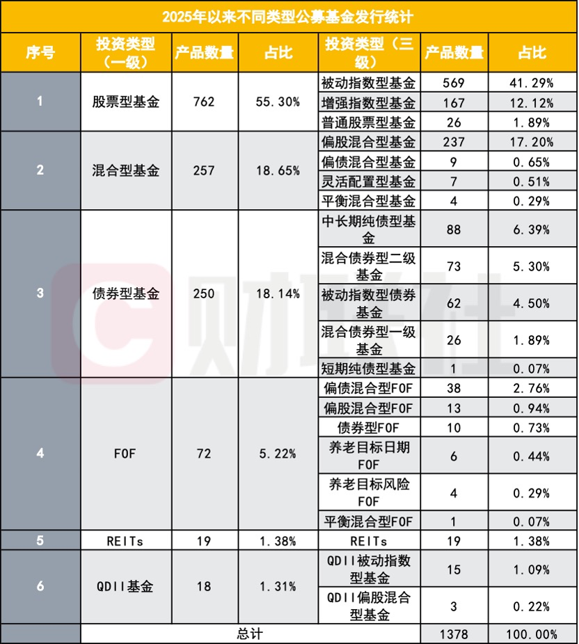 但这场发行潮的结构性特征更值得审视。从发行类型分布看,今年权益类基金的发行占比高达72.5%,其中股票型基金与偏股混合型基金合计发行999只,重回市场主导地位;与此同时,指数化投资全面开花,今年发行的813只指数型基金中,被动指数型基金达646只,占指数型基金总量的79.46%,同时贡献了全市场新基的46.88%。