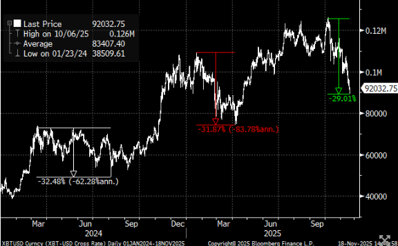 比特币在上周五跌破10万美元,并在本周一度跌至89500美元。目前,该代币价格在92000美元上下,今年以来的所有涨幅几乎已完全抹去。