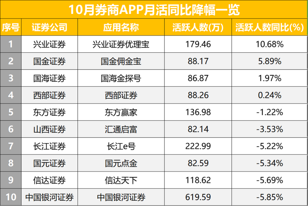受此影响多家券商APP月活同比下滑,仅4家逆势上涨,分别为兴业证券兴业优理宝APP(10.68%)、国金证券国金佣金宝APP(5.89%)、国海证券国海金探号APP(1.97%)、西部证券APP(0.24%)。