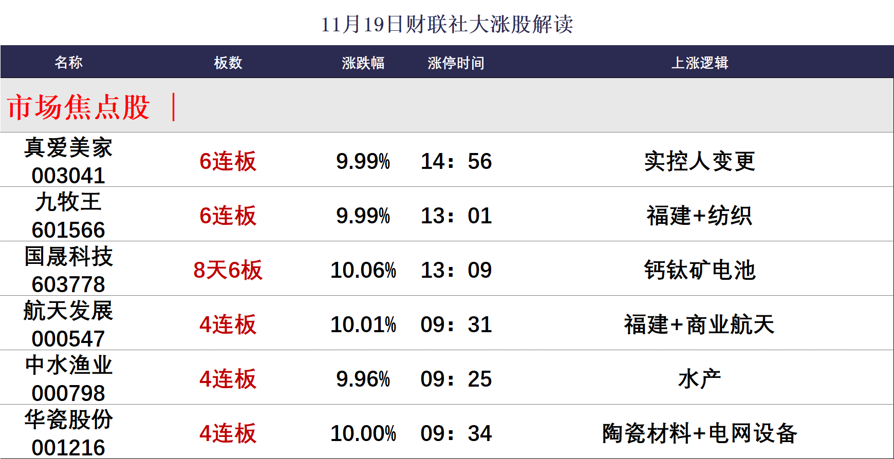 财联社11月19日讯,今日54股涨停,21股炸板,封板率为72%,真爱美家、九牧王6连板,中水渔业、华瓷股份、航天发展4连板,浪潮软件、金圆股份3连板,国晟科技8天6板,合肥城建8天4板,佛塑科技、融捷股份5天3板,江龙船艇20cm3天2板。市场窄幅震荡,沪指、创业板指均收红。沪深两市成交额1.73万亿,较上一个交易日缩量2002亿。盘面上,市场热点较为杂乱,全市场超4100只个股下跌。板块方面,贵金属、军工、养殖业等板块涨幅居前,海南、燃气、影视院线等板块跌幅居前。截至收盘,沪指涨0.18%,创业板指涨0.25%。