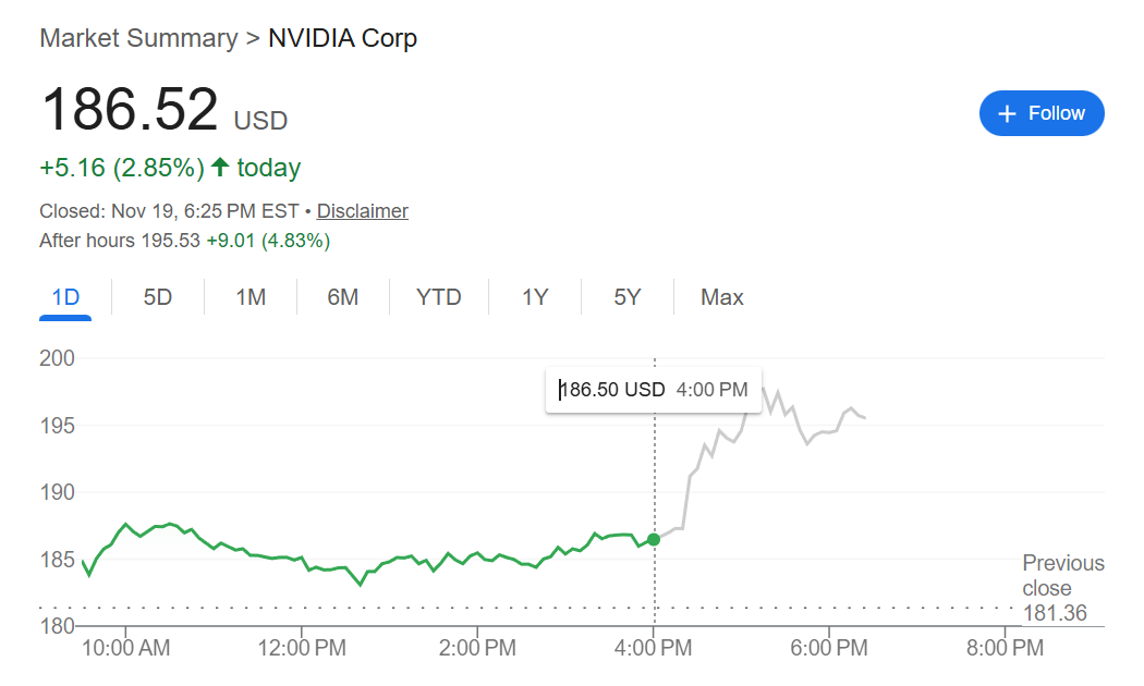 财联社11月20日讯(编辑 刘蕊)美东时间周三盘后,美股“AI”领头羊英伟达公布了第三季度财报。这份财报业绩本身几乎可称“完美”:不仅在营收和盈利方面均超出分析师预期,并且给出了超出预期的前景展望。公司股价也在盘后上涨,截至发稿涨幅为4.84%。