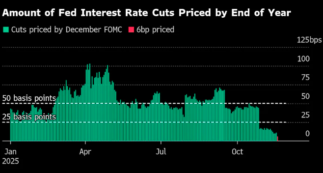 数据显示,与美联储政策利率挂钩的掉期市场目前仅计入了12月政策会议6个基点的宽松预期——相当于降息25个基点的可能性约24%,到明年1月的累计宽松预期仅为19个基点。而在周三之前,掉期市场计入的12月宽松预期为11个基点,意味着三周后美联储降息的概率大致为五五开。