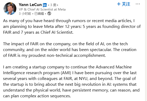 “我正在创办一家初创公司,继续过去几年在Meta FAIR实验室、纽约大学及更广泛领域与同事们共同推进的“高级机器智能”(AMI)研究计划,”杨立昆写道,“新公司的目标是推动人工智能的下一次重大革命:打造能够理解物理世界、具备持久记忆、能进行推理并规划复杂动作序列的系统。”