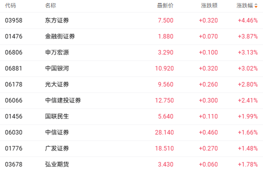 财联社11月20日讯(编辑 胡家荣)受益于中金公司合并预期等利好,港股券商板块多数走强,截至发稿,东方证券(03958.HK)涨4.46%、申万宏源(06806.HK)涨3.13%、中国银河(06881.HK)涨3.02%、光大证券(06178.HK)涨2.80%。
