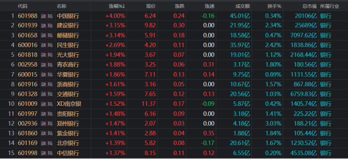 注:今日涨幅居前的银行股(截至11月20日收盘)